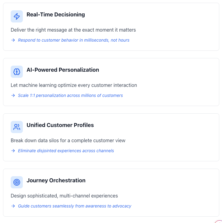Decision management that actually works. Most personalization engines require data scientists to build and maintain complex models. AJO’s offer decisioning uses AI to automatically learn which offers perform best for which customers, and it gets smarter over time without constant tuning.